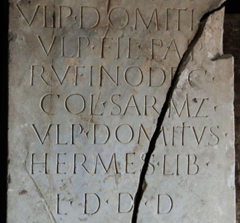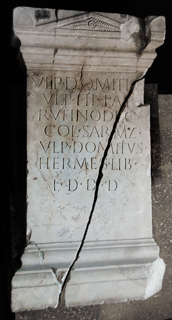 - Ulp(io) Domitio / Ulp(i) fil(io) Pap(iria) / Rufino dec(urioni) / col(oniae) Sarmiz(egetusae) / Ulp(ius) Domitius / Hermes lib(ertus) / l(ocus) d(atus) d(ecreto) d(ecurionum)