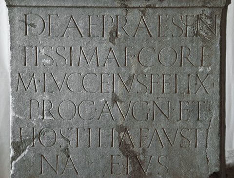 - Deae praesen/tissimae Core / M(arcus) Lucceius Felix / proc(urator) Aug(usti) n(ostri) et / Hostilia Fausti/na eius