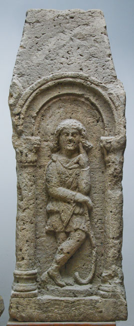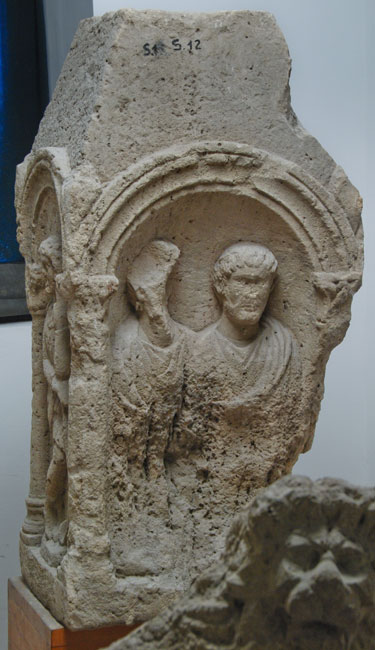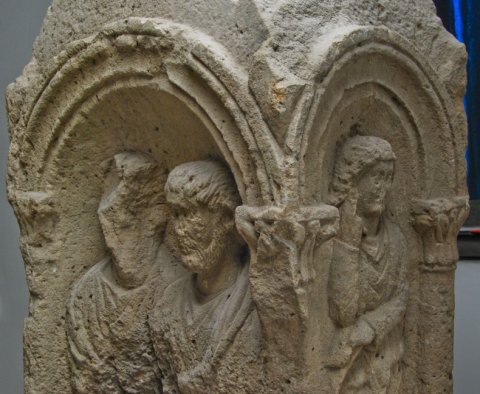 - Reliefs auf allen vier Seiten unter profilierten Bögen, die von Säulen getragen werden. Vorderseite: zwei sitzende Ganzfiguren (Ehepaar). Links Frau, rechts Mann in Toga. Nebenseiten: auf Pedum gelehnter Attis. Rückseite: Krater mit Weinranken. Glattes Pyramidendach.