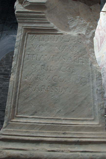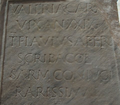 - Valeria Cara / vix(it) an(nos) XXIX / T(itus) Flavius Aper / scriba col(oniae) / Sarm(izegetusae) coniugi / rarissimae