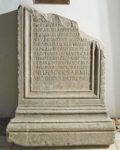 - Q(uinto) Axio Q(uinti) f(ilio) Pal(atina) A[elian(o)] / eq(uiti) R(omano) Laurenti Lavin[ati] / curatori ad popul(um) vi[ar(um)] / Traianae et Aureliae [et] / Aeclanensium proc(uratori) ad alim(enta) / per Apuliam Calabriam Lu/caniam et Bruttios proc(uratori) / rat(ionis) priv(atae) prov(incia) Maur(etaniae) Caes(ariensis) / item per Belgicum et duas / Germanias proc(uratori) prov(inciae) / Dac(iae) Apul(ensis) bis vice praesidis / ordo col(oniae) Sarmiz(egetusae) / metropolis patrono