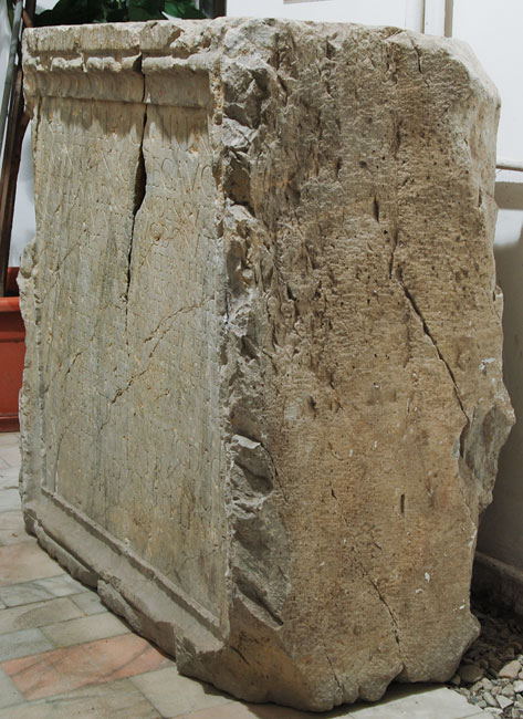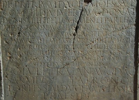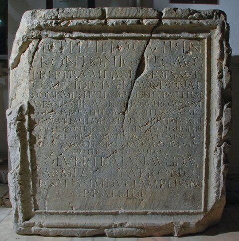 - M(arco) Cl(audio) Ti(beri) filio Quirin(a) / Frontoni co(n)s(uli) leg(ato) Aug(usti) / pr(o) pr(aetore) trium Dac(iarum) et Moes(iae) sup(erioris) / comiti divi Veri Aug(usti) donat(o) / donis milit(aribus) bello Armen(iaco) et Parth(ico) ab / Imp(eratore) Antonin(o) Aug(usto) et a divo Vero Augus(to) / coron(a) mural(i) item vallar(i) item classic(a) / item aurea item hast(is) puris IIII item vexill(is) / curator(i) oper(um) locorumq(ue) public(orum) leg(ato) leg(ionis) I Min(erviae) / leg(ato) leg(ionis) XI Cl(audiae) praetori aedili curuli ab actis / senatus quaestori urbano decemviro / stlitibus iudicandis / col(onia) Ulp(ia) Traian(a) Aug(usta) Dac(ica) / Sarmiz(egetusa) patrono / fortissim(o) duci amplissim(o) / praesidi