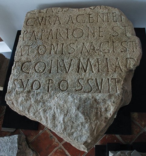- [I(ovi) O(ptimo) M(aximo)] / [c(ives) R(omani) c(onsistentes) vic(o)] / classicor[um] / cura(m) agente M(arco) / Papirione St[r]/atonis magistr(o) / T(itus) Collumela(!) d[e] / suo possuit(!)
