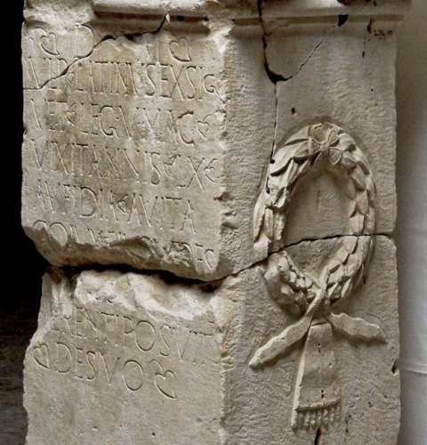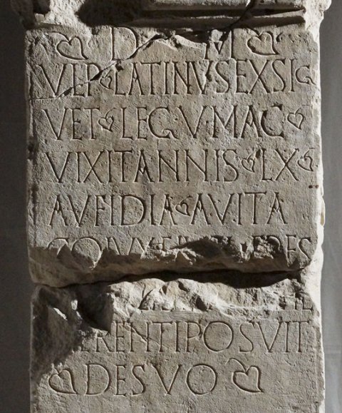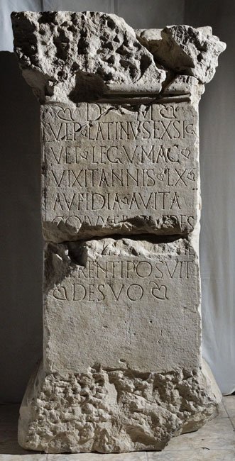- D(is) M(anibus) / Ulp(ius) Latinus ex sig(nifero) / vet(eranus) leg(ionis) V Mac(edonicae) / vixit annis LX / Aufidia Avita / co(n)iux eius heres / [pienti]ssim[a be]ne / [m]erenti posuit / de suo