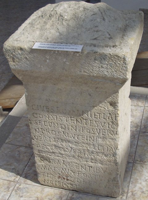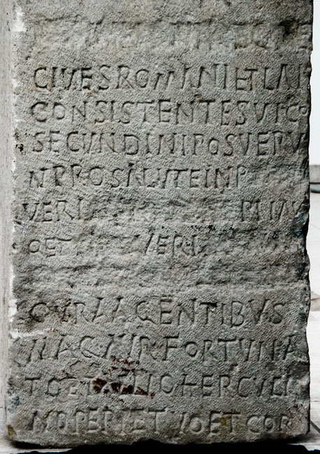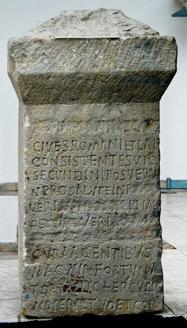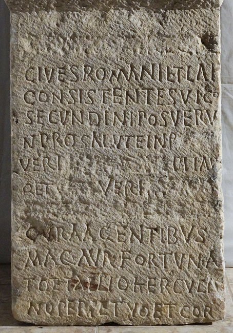 - [[I(ovi) O(ptimo) M(aximo)]] / [[et Iunoni Reginae]] / civesRomani et Lai / consistentes vico / Secundini posueru/nt pro salute Inp(eratoris)(!) [[[C(ai) Iul(i)]]] / Veri [[[Ma]xim[i]n[i]]] Pii Au/g(usti) et [[[C(ai) Iul(i)] Veri [Maximi]]] / [[[nobilissimi Caesaris]]] / cura agentibus / mag(istris) Aur(elio) Fortuna/to et Aelio Hercula/no Perpetuo et Cor[neliano co(n)s(ulibus)]