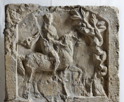 - Mythische Figur: über der Inschrift eingetieftes Bildfeld mit Giebel, darin Thrakischer Reiter nach rechts, vor ihm Baum mit Schlange.
