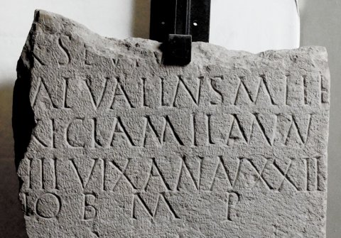 - ---]/[---]R(?) se vivi(?) [---]A(?) / [- V]al(erius) Valens mile/[s l(egionis)] XI Cla(udiae) mil(itavit) ann/[os] III vix(it) ann(os) XXII / [fil]io b(ene) m(erenti) p(osuerunt)