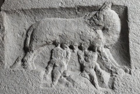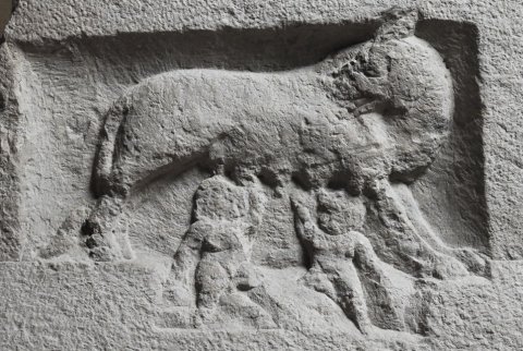 - Mythos: unter der Inschrift rechteckige Nische mit Lupa Capitolina.