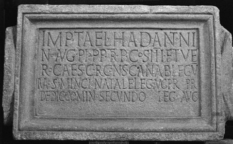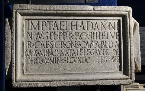 - Imp(eratori) T(ito) Ael(io) Had(riano) Antoni/no Aug(usto) Pio p(atri) p(atriae) tr(ibunicia) p(otestate) co(n)s(uli) III et Ve/ro Caes(ari) c(ives) R(omani) cons(istentes) canab(is) leg(ionis) V / Mac(edonicae) su(b) Minicio Natale leg(ato) Aug(usti) pr(o) pr(aetore) / dedic(ante) Cominio Secundo leg(ato) Aug(usti)