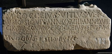 - Dis M(anibus) / M(arcus) Cocceius Vit(u)lus vet(eranus) coh(ortis) [I] / Ubio(rum) sig(nifer) vix(it) ann(os) LXX mili(tavit) ann(os) XXVIII / Claudia coniunx et Cocceius Veturius / et Cocceius Nardus f(ilii) h(eredes) f(aciendum) c(uraverunt) / M(arcus) Coc(c)eius Titio pi(i)s(simo) par(enti)(?) / f(aciendum)(?) c(uravit?)