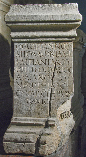 - griechisch: θεῷ∙ Γράννῳ∙ / Ἀπόλλωνι∙ αἰεὶ∙ / καὶ∙ πανταχοῦ∙ / ἐπηκόῳ∙ Ἄξιος∙ / Αἰλιανὸς∙ ὁ∙ / νεώτερος∙ / εὐχαριστήριον / Ἰόνιος