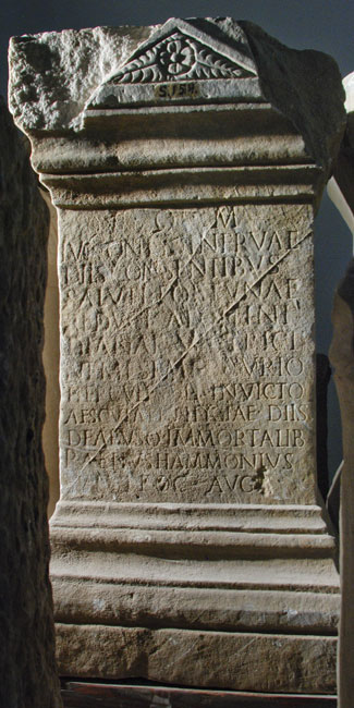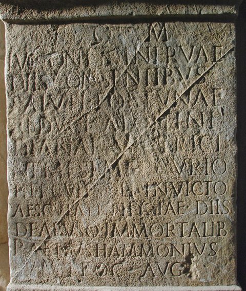 I(ovi) O(ptimo) M(aximo) / Iunoni [M]inervae / Diis Consentibus / Saluti Fortunae / Reduci Apollini / Dianae V[ic]trici / Nemesi Me[r]curio / Herculi Soli Invicto / Aesculapio Hygiae diis / deabusq(ue) immortalib(us) / P(ublius) Aelius Hammonius / v(ir) e(gregius) proc(urator)