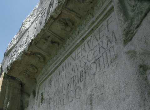 - Imp(erator) Caesar divi Nervae f(ilius) / Nerva Traianus Aug(ustus) Germ(anicus) / pontif(ex) maximus trib(unicia) pot(estate) IIII / pater patriae co(n)s(ul) III / montibus excisi[s] anco[ni]bus / sublat[i]s via[m r]e[fecit]