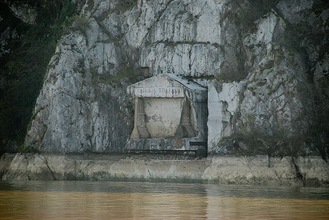 - Von zwei geflügelten Genien getragene tabula ansata. Darunter früher Darstellung des knienden Danuvius ?. Oben vorspringende Decke mit Kassetten mit Rosetten, Adler, Delphin. Das Schriftfeld war mit Stuck überzogen und die Buchstaben mit roter Farbe nachgezogen.