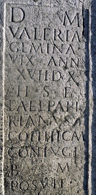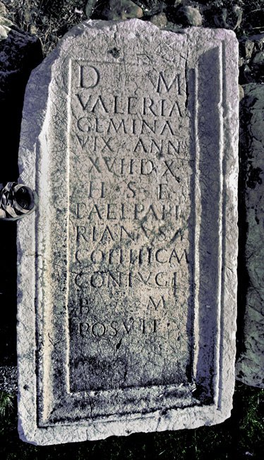 - D(is) M(anibus) / Valeria / Gemina / vix(it) ann(os) / XVII d(ies) X / h(ic) s(ita) e(st) / P(ublius) Ael(ius) Papi/rianus |(centurio) / coh(ortis) III Cam(pestris) / coniugi / b(ene) m(erenti) / posuit