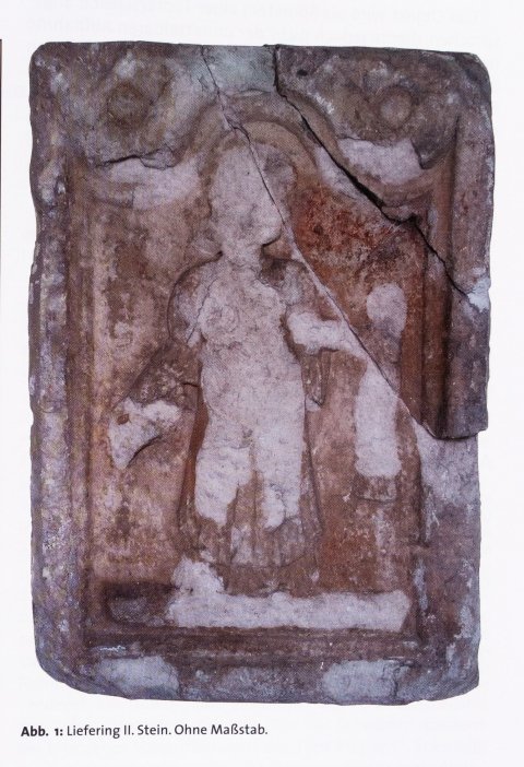 - Gerahmtes Relieffeld mit Bogen oben für den Kopf der Figur. Stehende Dienerin in Ober- und Untergewand, in der Linken mappa und Spiegel (?), in der Rechten Kanne.