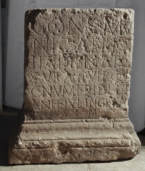- [I(ovi) O(ptimo) M(aximo)] / Cons(ervatori) mu/nic(ipii) Aeli / Hadr(iani) Napoc(ae) / cura IIvir(orum) q(uin)q(uennalium) / C(ai) Numeri Deci/ani et Iuli Ingenui / v(otum) s(olverunt) l(ibentes) m(erito)