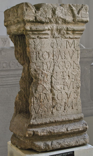 - I(ovi) O(ptimo) M(aximo) / pro salute / C(ai) Iul(i) Con/[s]tantis / [p]ontif(icis) C(aius) Iul(ius) / Marcus / v(otum) s(olvit) l(ibens) m(erito)