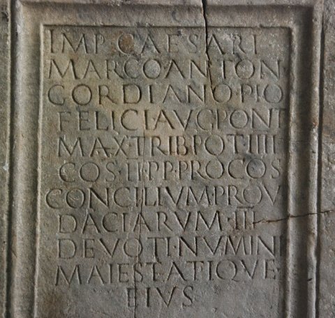 - Imp(eratori) Caesari / Marco Anton(io) / Gordiano Pio / Felici Aug(usto) pont(ifici) / max(imo) trib(unicia) pot(estate) IIII / co(n)s(uli) II p(atri) p(atriae) proco(n)s(uli) / concilium prov(inciarum) / Daciarum III / devoti numini / maiestatique / eius