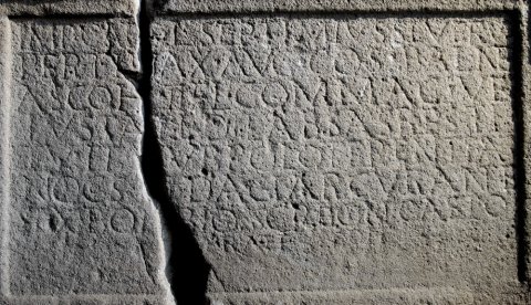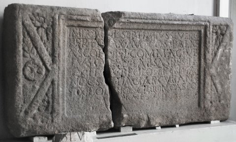 - Imp(erator) Caes(ar) L(ucius) Septimius Severus / Pertinax Aug(ustus) co(n)s(ul) balne/as coh(ortis) II Fl(aviae) Commag(enorum) ve/tustate dilabsas resti/tuit sub Polo Terentia/no co(n)s(ulari) III Daciar(um) curante Sex(to) Boebio Scribonio Casto / praef(ecto) coh(ortis)
