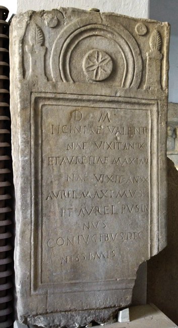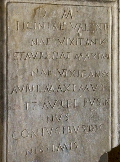 - D(is) M(anibus) / Liciniae Valenti/nae vixit an(nos) LX / et Aureliae Maximi/nae vixit an(nos) XX / Aurel(ius) Maximus / et Aurel(ius) Pusin/nus / coniugibus dig/nissimis