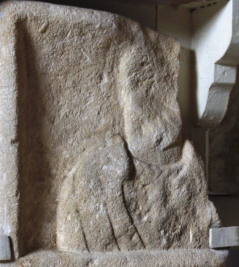 - Zwei einfach gerahmte Relieffelder übereinander: oben Brustbild einer Frau im Mantel, an den Schultern Fibeln (?). Unten frontal stehende Dienerin, neben dem Kopf Rosette, neben dem rechten Bein Reliefrest mit D (?).
