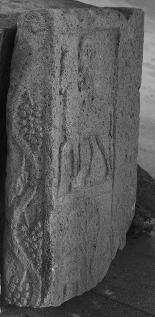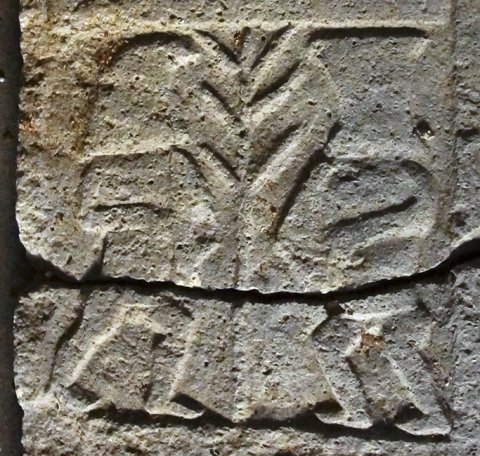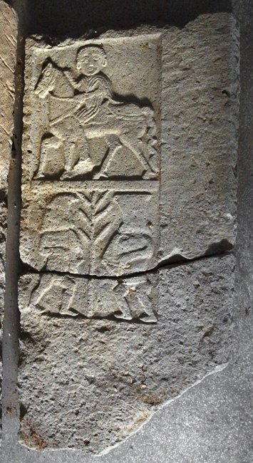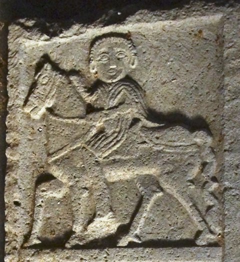 - Innenseite einer linken Seitenwange (?): im oberen Bildfeld Reiter nach links, im unteren zwei kämpfende (?) Figuren mit Kapuzen (Helm ?), zwischen ihnen Baum.
