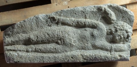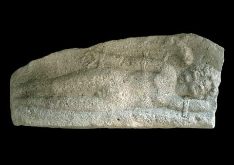 - Mythos : im flachen Bogenfeld des Giebels liegender toter Ikarus mit langen Locken, an den Armen mit Riemen befestigte Flügel.