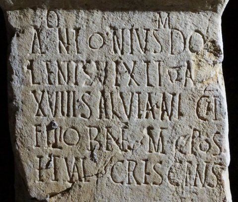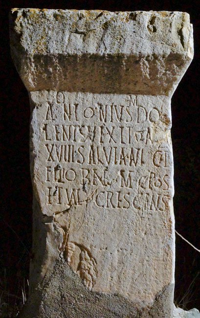 - D(is) M(anibus) / Antonius Do/lentis vixit ann(os) / XVIII Salvia Anicii / filio bene m(erenti) pos(uit) / et Val(erius) Crescens