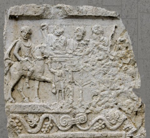 - Totenmahl mit drei Männern auf einer Kline, rechts sitzende Frau, unter der Kline dreibeiniger Tisch, links Diener, der das Pferd eines von links kommenden Reiters hält. Auf der Rahmenleiste des Schriftfeldes Weinranken.