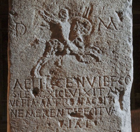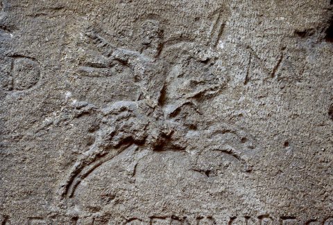 - Über der Inschrift zwischen den Buchstaben D M Reiter im Galopp.