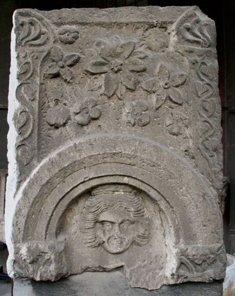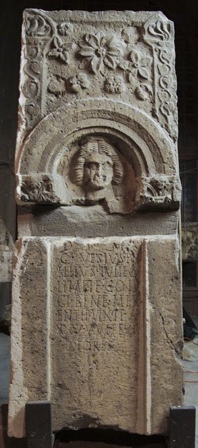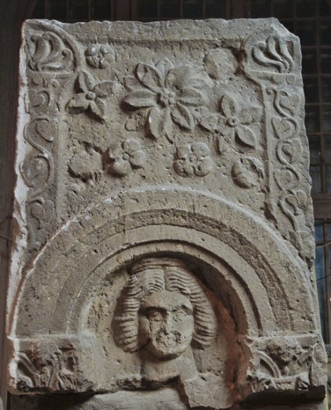 - Oben neun verschieden geformte Rosetten zwischen Pilastern mit Efeuranken und Palmettenakroteren. Darunter profilierter Bogen auf Kapitellen, im Bogenfeld Kopf einer Frau mit gewellten, auf dem Oberkopf zu einem Kranz aufgestecktem Haar.
