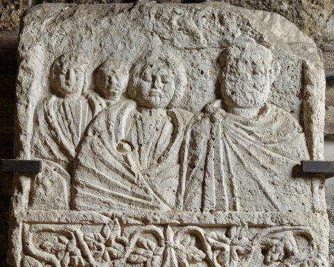 - Über der Inschrift einfach gerahmtes Bildfeld mit Brustbildern einer Familie: vorn Ehepaar (links Frau im Mantel, rechts bärtiger Mann im Sagum mit Scheibenfibel), links hinter der Frau Mädchen und Knabe. Auf der Rahmenleiste des Schriftfeldes Weinranken, die aus einem Krater wachsen.