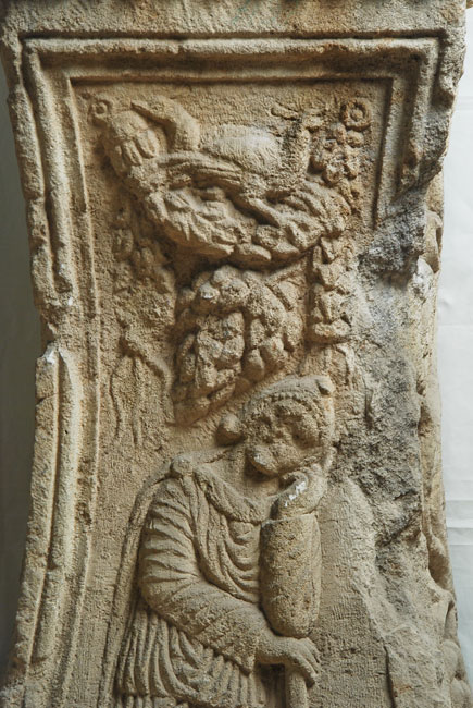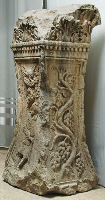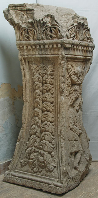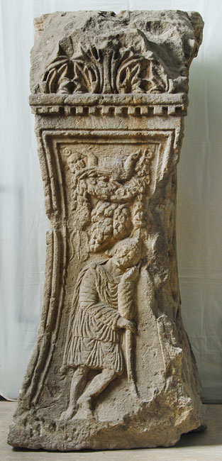 - Pyramidenstumpf mit korinthischem Pfeilerkapitell. Auf der Vorderseite Attis unter einer Girlande mit zwei Pfauen, auf der linken Seite Akanthusornament, auf der rechten Weinranke. Bildfelder jeweils gerahmt, unter dem Kapitell auf drei Seiten umlaufender Zahnschnitt.