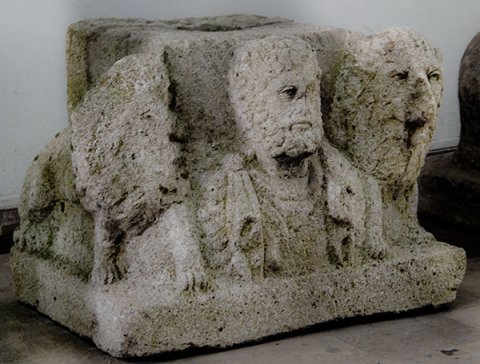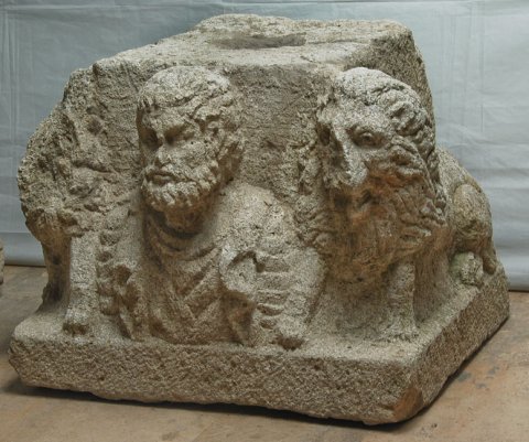 - Auf der Vorderseite Büste eines bärtigen Mannes im Sagum mit Scheibenfibel, flankiert von an den Seiten des Pyramidenstumpfs stehenden Löwen. Auf der Rückseite zwei weitere Löwen.