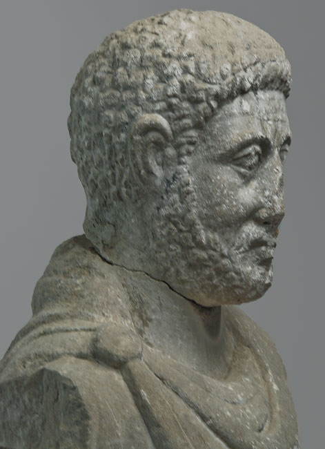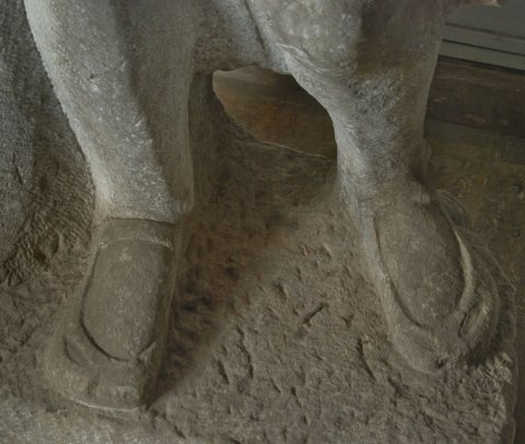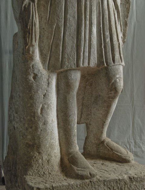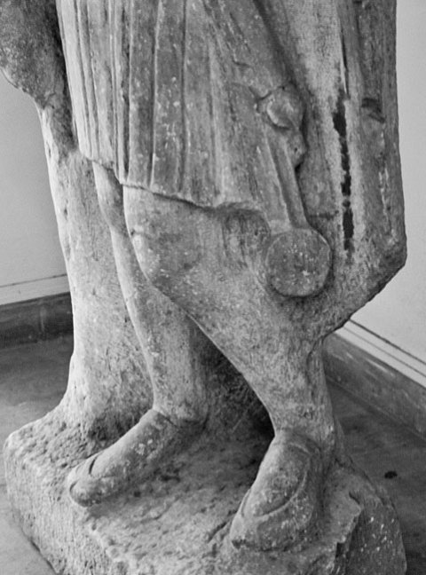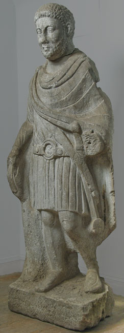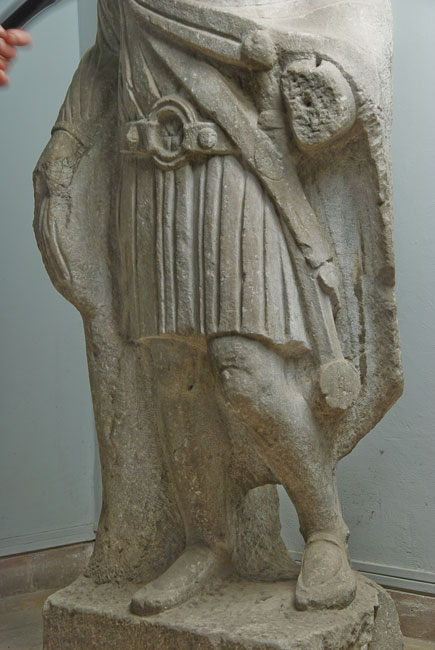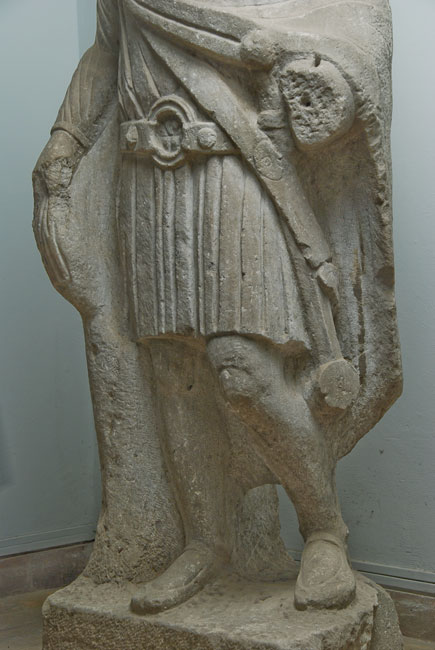 - Stehender bärtiger Mann (Offizier) in kurzer Tunica, Gürtel mit Ringschnalle, Sagum mit Scheibenfibel, Schuhen. Waffen: Schwertgurt (balteus) mit an der linken Seite hängendem Schwert in Scheide mit Dosenortband.