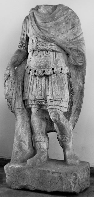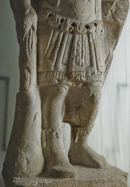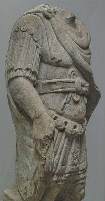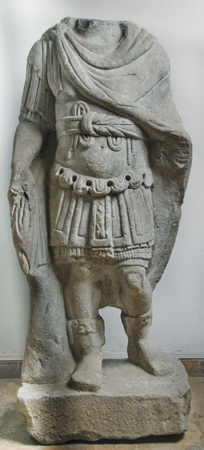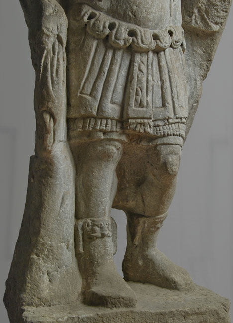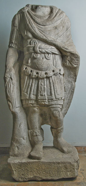 - Stehender Offizier: Brustpanzer mit Pteryges und Laschen, Feldherrenbinde, Sagum mit Scheibenfibel, Stiefel. Neben dem rechten Bein Stütze.
