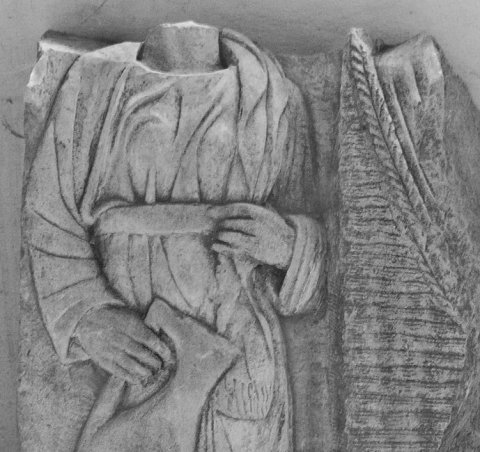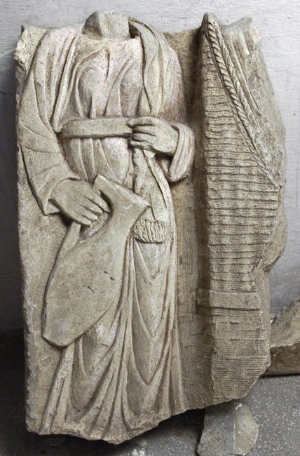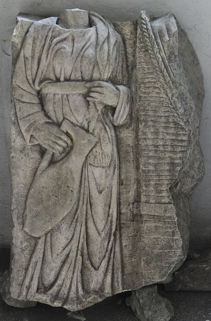 - Fragment eines Totenmahl-Reliefs: erhalten ist am linken Rand eine Dienerin in gegürtetem Ärmelgewand, in der rechten Hand große Kanne, die Linke fasst die über der Schulter liegende mappa mit Fransensaum. Rechts anschließend Korbsessel mit Rest einer darin sitzenden Frau.