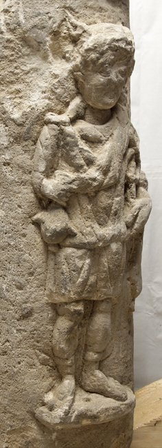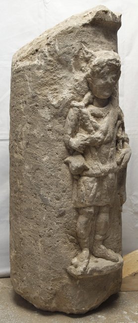 - Mythische Figur. Glatter Säulenschaft mit Relief: auf einer Standleiste stehender Mercur in Flügelkappe, kurzer Tunica und Mantel, im linken Arm Caduceus.