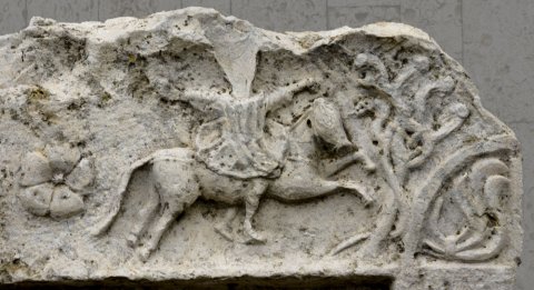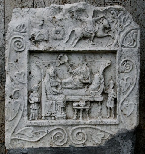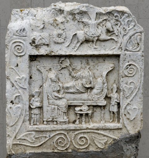 - Totenmahl: rechteckiges Bildfeld, Kline mit hoher Lehne, darau gelagerter Mann mit Kranz in der erhobenen Rechten. Links Frau auf Lehnsessel, vorn dreibeiniger Tisch mit Speisen, links Dienerin, rechts Diener. Auf der Rahmenleiste unten und seitlich Efeuranken, oben zwischen Akroteren mit Halbpalmetten nach rechts galoppierender Reiter, vor ihm Baum mit Schlange, hinter ihm große Rosette und bekleidete Büste (Windgott ?).