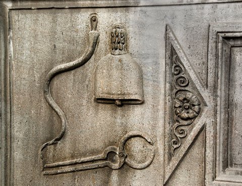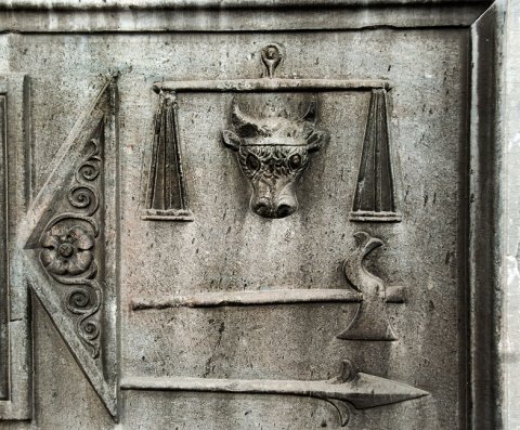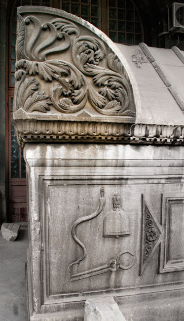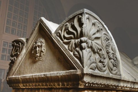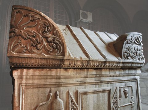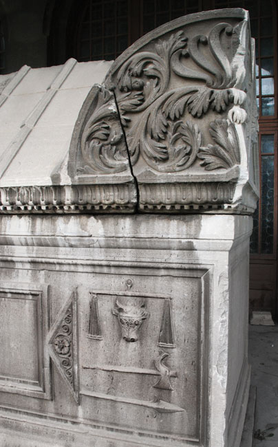 - Deckel in Form eines Ziegeldaches mit Eckakroteren, darin Akanthusblätter, Palmetten und Ranken. In beiden Giebelfeldern Gorgoneion. Am Deckelrand Kymation. Kasten auf Vorderseite und Nebenseiten mit profiliertem Rahmen, auf der Vorderseite tabula ansata mit Rosetten und Ranken in den ansae. Seitlich der tabula Opfergeräte und Waffen (links Peitsche, Zange, Glocke, rechts Waage, Stierkopf, Axt und Speer).