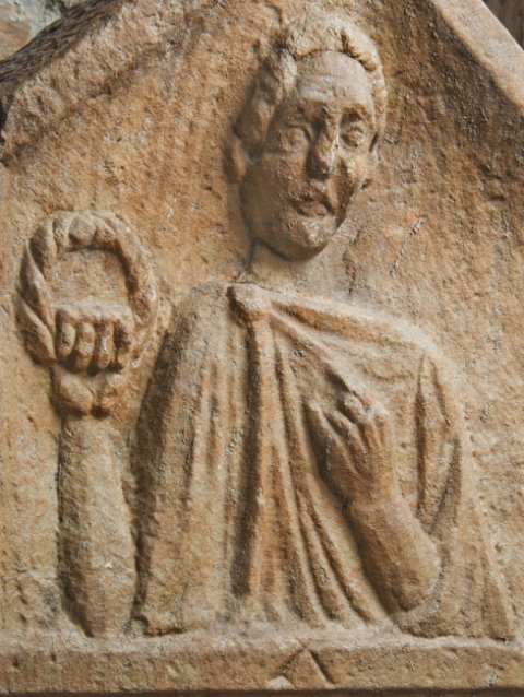 - Unter offenem Giebel Brustbild eines Mannes: bartlos, Tunica, Sagum, Scheibenfibel, in der erhobenen Rechten Kranz.