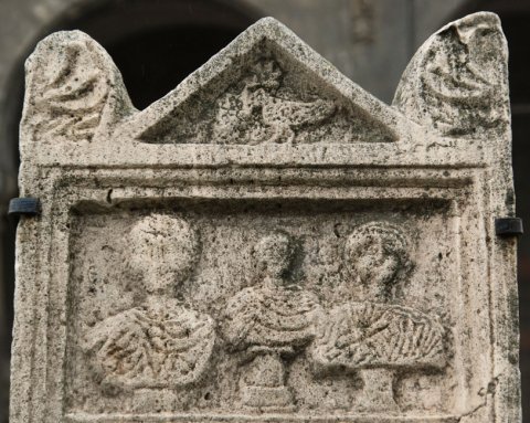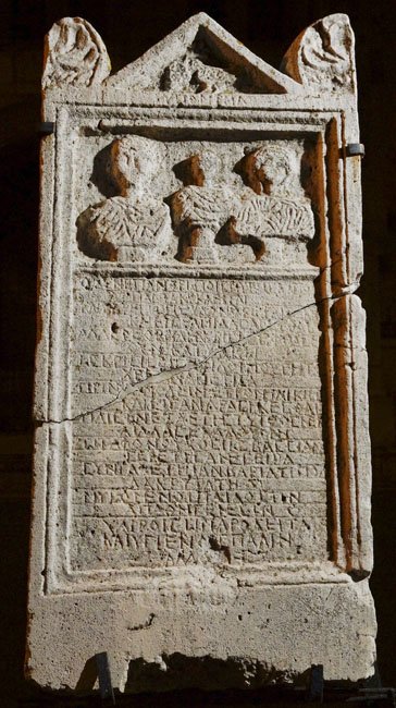 - Giebel mit Vogel und Blüte, Eckakrotere mit Palmetten, Rechteckiges Bildfeld mit Büsten einer Familie (Knabe zwischen Eltern). Die Büsten sind bekleidet und stehen auf Postamenten.