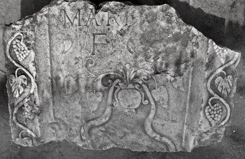 - Auf der Rahmenleiste Weinranke, unter der Inschrift Krater, aus dem Efeuranken und Blumen wachsen, seitlich davon zwei Schlangen.