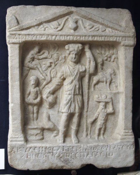 - Mythische Figur: Bildnische zwischen Pilastern, die einen Giebel mit Krater und Ranken tragen. In der Mitte frontal stehender Dionysos - Liber Pater in Stiefeln, kurzem Chtiton und Nebris, Weinkranz im Haar, Thyrsosstab in der Linken, Kantharos in der Rechten. Neben dem rechten Fuß Panther, die Vorderpranken auf einem runden Postament, auf dem Priapos steht. Darüber weinlesender Pan. Neben dem linken Bein des Dionysos kleine Silensfigur, die Fruchtkorb auf dem Kopf trägt, darüber auf eigener Standleiste Reiter. Votivinschrift auf dem Architrav und der Sockelleiste.