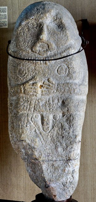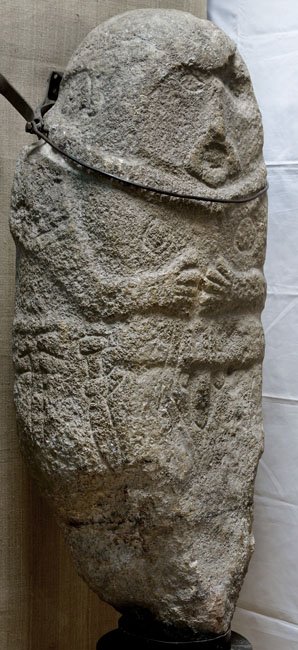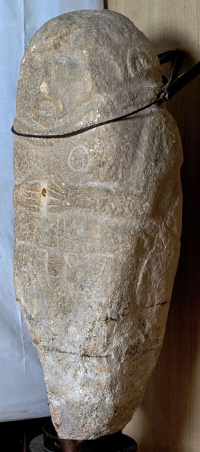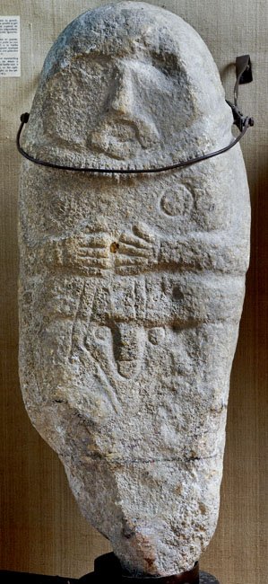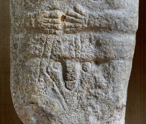 - Bärtige Figur mit auf die Brust gelegten Händen und breitem Gürtel.
