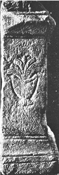 - Auf der linken Nebenseite Gefäß mit Kornähren, auf der rechten Gefäße (oben patera, unten Kanne).