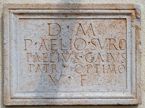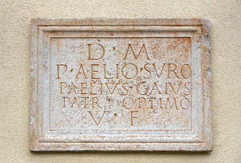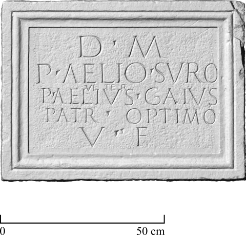 - D(is) M(anibus) / P(ublio) Aelio Suro / veter(ano) / P(ublius) Aelius Gaius / patr(i) optimo / v(ivus) f(ecit)