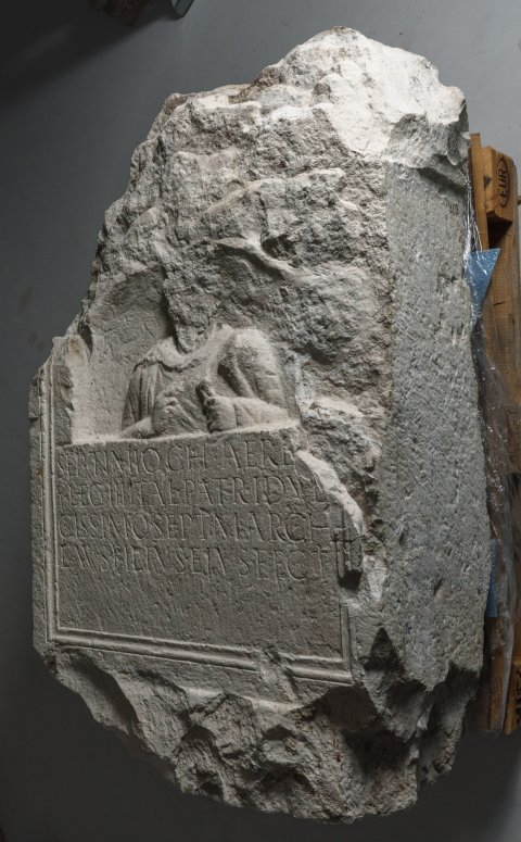 - Deck- und Sockelgesims fast völlig abgeschlagen. Vorderseite profiliert gerahmt, über der Inschrift rahmenlose Bildnische mit Brustbild eines Mannes in Ärmeltunica und Sagum, in der Linken Rolle (volumen).