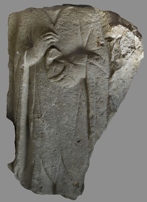 - Ganzfigur eines stehenden Knaben in Paenula, in den Händen Vogel. Rechts weitere Figur, links senkrechter Bruch oder beschnitten ?